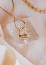 14k Bezel with a gold filled bail; the bezel is hand embellished with an arrow design, also known as chevron mark of the goddess  worn to signal others within the same field of an ally. Chevron designs were typically found on shields and represent protection. It can also mean forward movement and creation of a flow. Hangs from A 18" gold filled herringbone chain