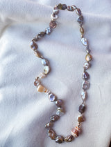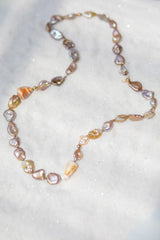 A simple ocean-inspired design, perfect for dressing up or down. Made to slip over your head, with no clasp needed. Keshi pearls in amber, pink, and lavender, accented with gold details, puka shells, and Maui cone shells, all carefully hand-tied. A one-of-a-kind piece, made in Hawaii.