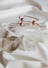 A Cuff made for a Queen. Three stunning high luster pearls secured on thick luxe gold filled wire. Easily flexes to the shape of your wrist. A true statement cuff that will make you smile when you look down. One size fits most. Inquire if you have a larger or smaller than average wrist.