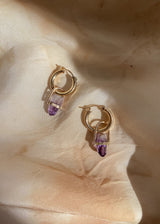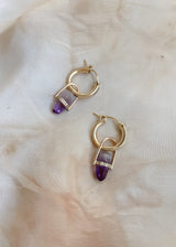 These amethyst are set in 14k gold bezels with intention & hand stamping of an arrow design all the way around on a 14k gold filled hoop.