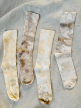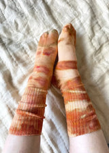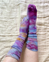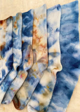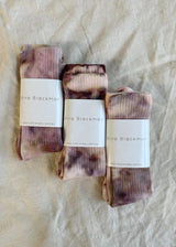 A super limited batch of the softest dreamiest bamboo rayon socks ever. Soooo soft and cozy. These pieces are dyed by hand in our backyard studio. Every element from the temperature that day, to the way the wind is blowing, affects they way they come out. It's a truly magical and collaborative process.